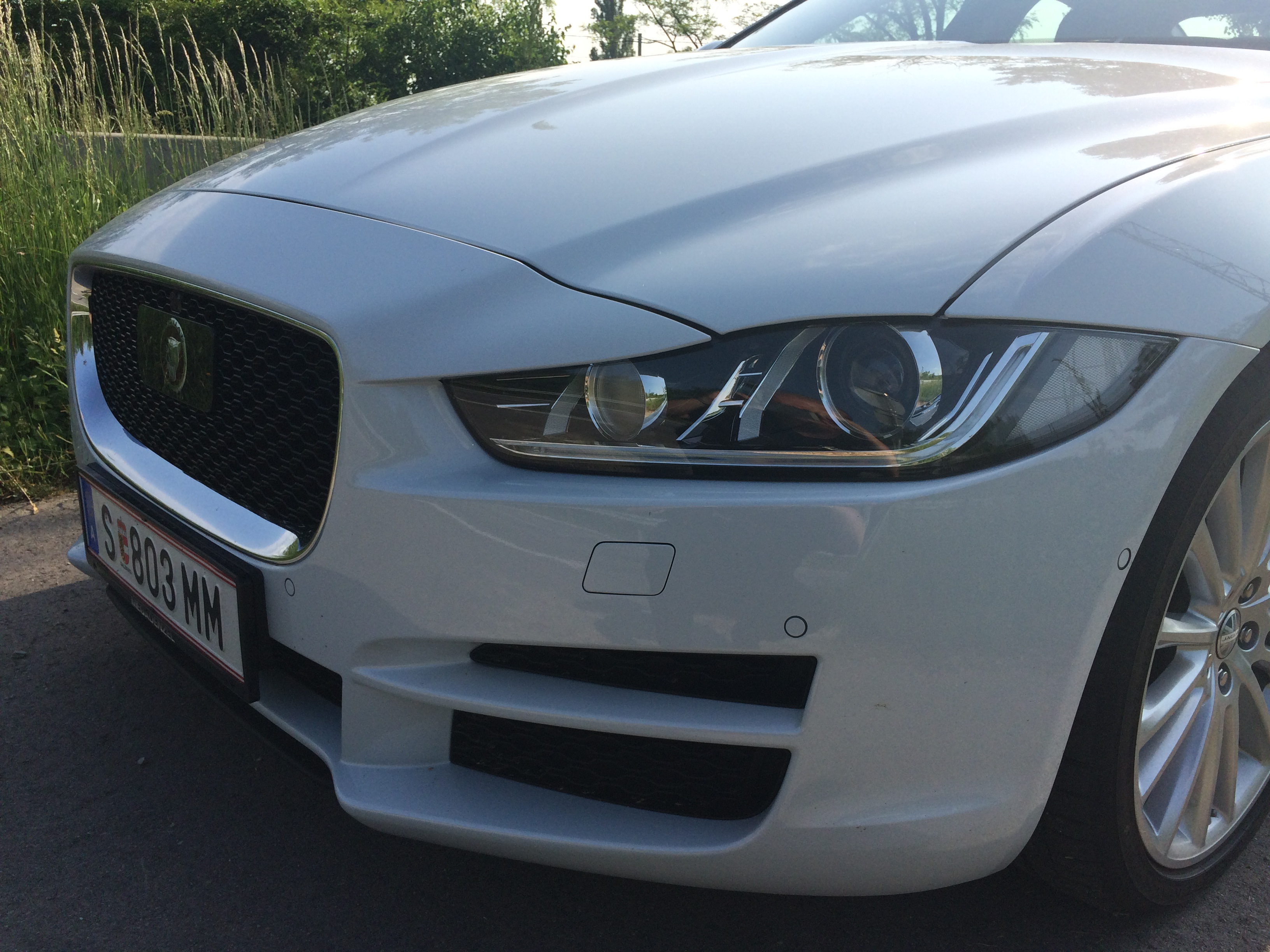 Das Fahrzeug steht bei Denzel in Erdberg bereit. Ein Jaguar 20d Portfolio mit dem brandneuen ‚Ingenium Motor‘ (2 Liter Turbo-Diesel, 8-Gang-Automatik, 180 PS, Durchschnittsverbrauch 4,2l/100 Km, 0-100 in 7,8, Spitze 228 – alles Werksangaben). Gekleidet ist er in ein frostiges ‚Glacier White‘, das die Sonnenstrahlen gekonnt reflektiert.