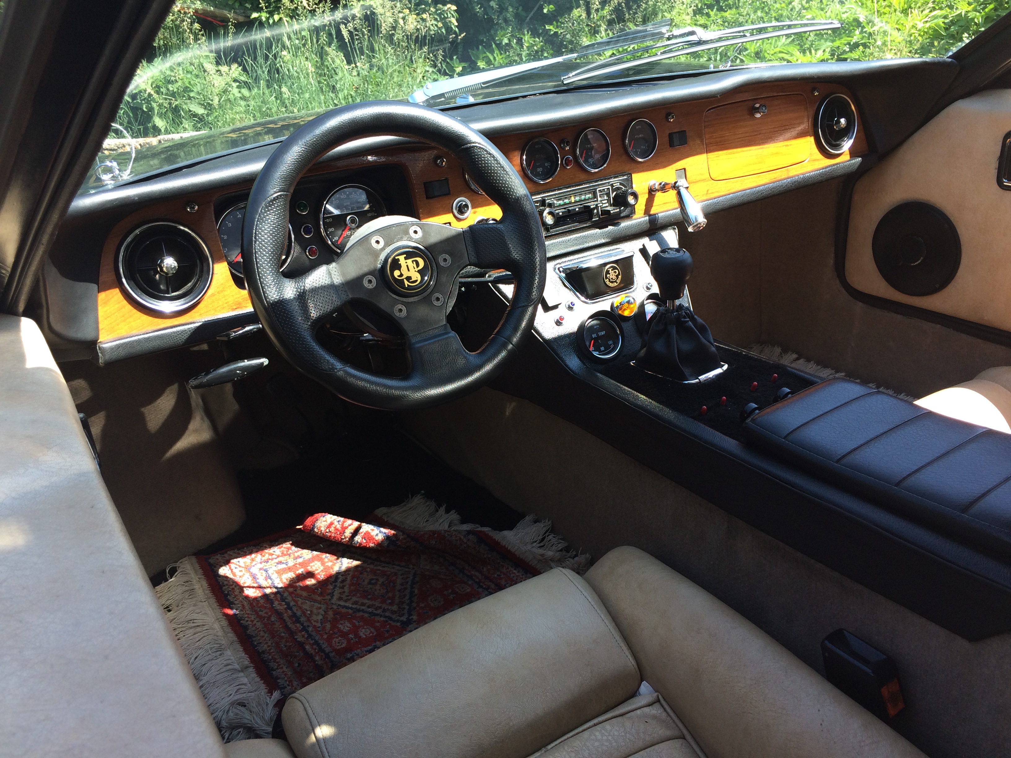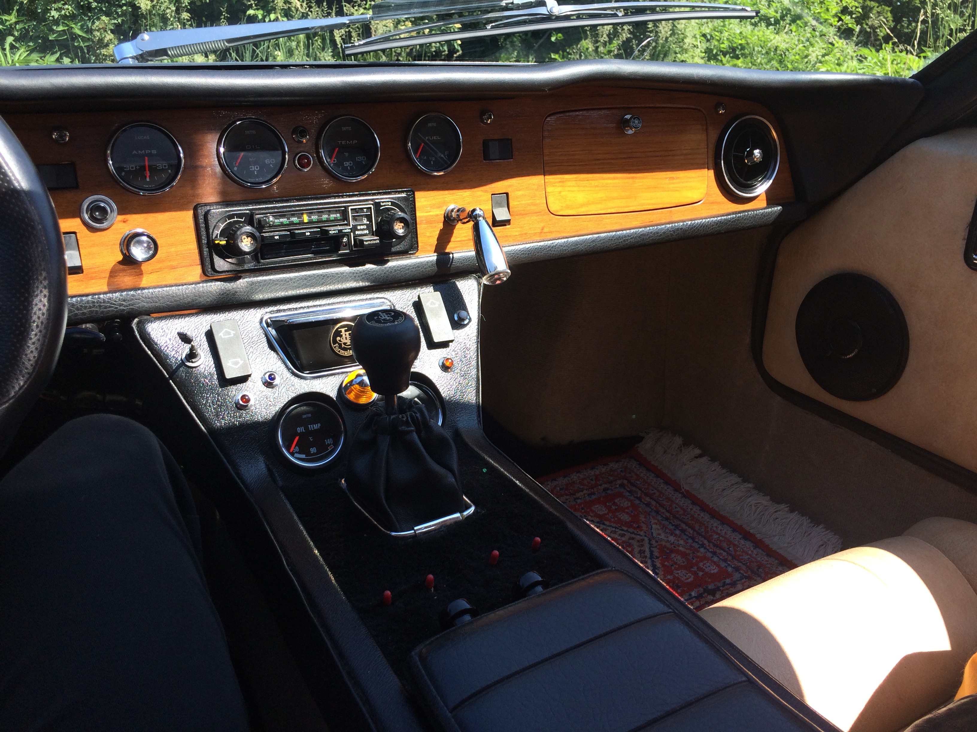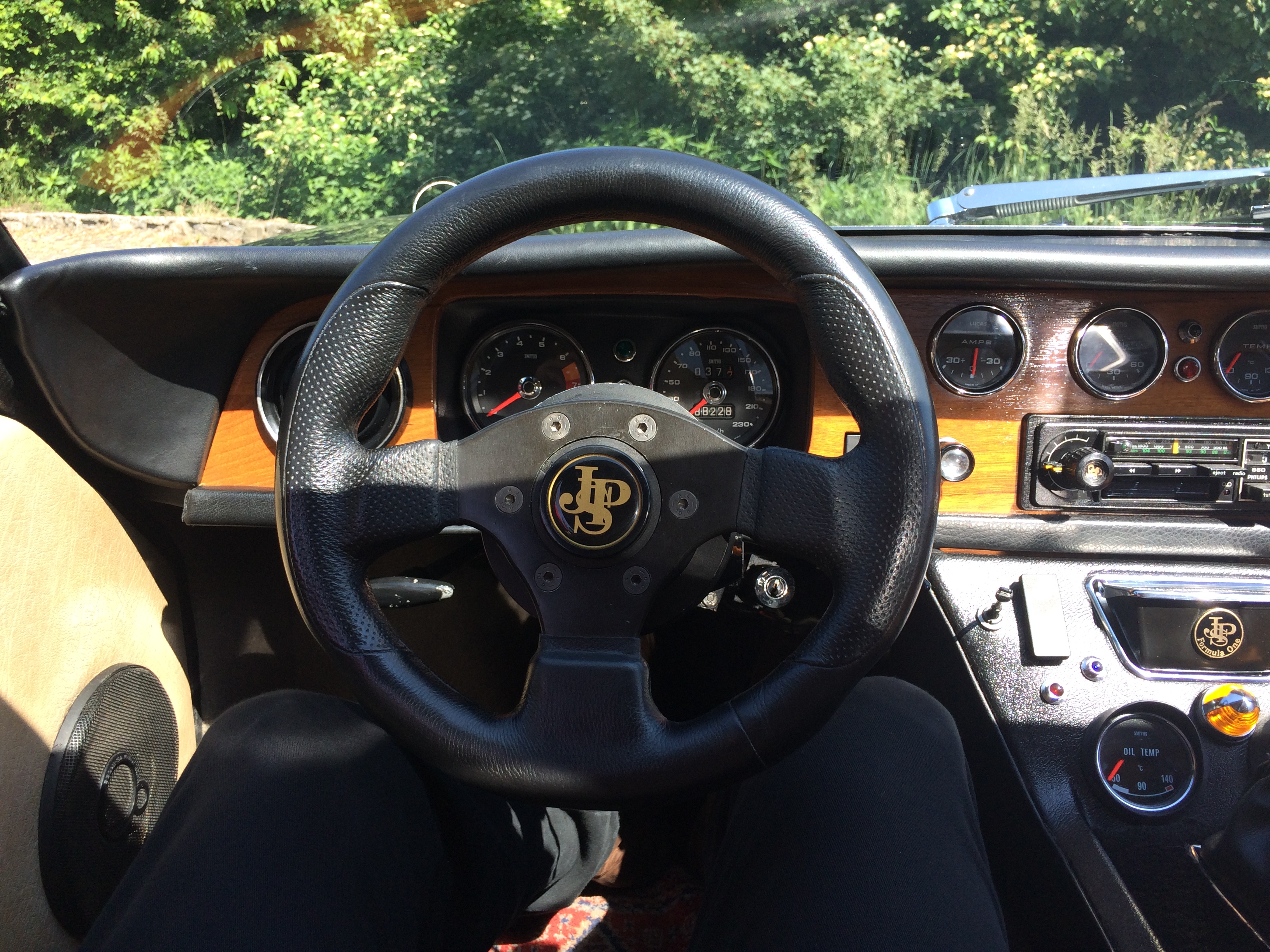 IMG_3747Vor dem Abschied und der Weiterfahrt darf ich kurz Probesitzen. Das Einfädeln auf den fix montierten Fahrersitz ist für mich eine akrobatische Übung. Die Kunststoff-Tür fällt ins Schloss und ich fühle mich um Jahrzehnte in die Vergangenheit katapultiert. Pures, britisches Rennsport-Feeling. Der Europa schmiegt sich um mich – passt wie angegossen. Die Pedale sind ideal angeordnet – für Schuhgröße 37 oder kleiner. Das Lenkrad in der Größe eines Dessert-Tellers erinnert an die Formel 1 Boliden der 70er Jahre. Der rechte Unterarm ruht auf der mächtigen Mittelkonsole. Der etwa 10 cm lange Schalt-Stick fällt wie von selbst in die Hand und will mit Nachdruck geführt werden – klick-klack. Der Blick streift über ein Armaturen-BRETT aus echtem Holz und die Smiths-Instrumente warten darauf, wichtige Informationen die über den Zustand von Motor und Elektrik zu liefern.