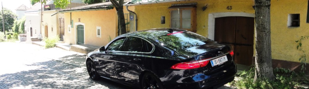 „Es wird ein Wein sein und wir werden nimmer sein…“, sang schon Hans Moser vor vielen vielen Jahren. Doch bevor wir ’nimmer sind‘ und nur mehr der Wein überbleibt, setzen wir uns in eine stilvolle, britische Reise-Limousine. Ein Jaguar XF 2.0d R-Sport der letzten Generation trägt uns über feine Straßen des Weinviertels im beschaulichen Osten Niederösterreichs. Der edle Farbton ‚dark sapphire‘ wirft das Blau des Himmels volley in die Landschaft zurück.