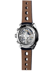 Die neue Bremont MKII bringt ihren Träger zurück in die goldene Ära des Motorsports der 1960er Jahre. Das weiße Ziffernblatt zeigt das traditionelle Jaguar-Logo über der Sechs-Uhr-Position; die Stundenanzeige kopiert die Ziffern auf den Instrumenten des E-Type. Das klassische Layout eines Chronographen wird über das wunderschön verzierte BE-50AE Automatikuhrwerk erreicht. Zwei kleine Ziffernblätter auf Drei-Uhr- und Neun-Uhr-Position ergänzen die Hauptanzeige – die dezente rote Linie am 60-Minuten-Zähler findet sich genauso auch auf der Drehzahl-Skala des Rennwagens.