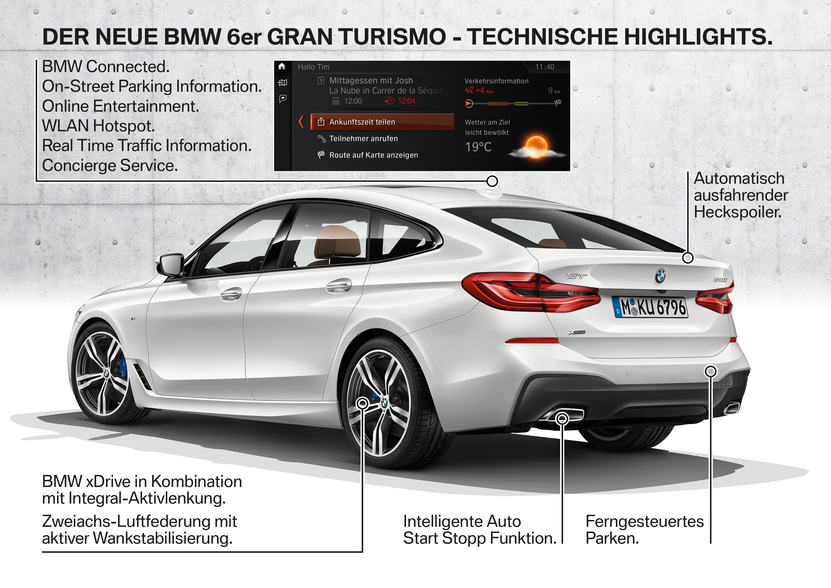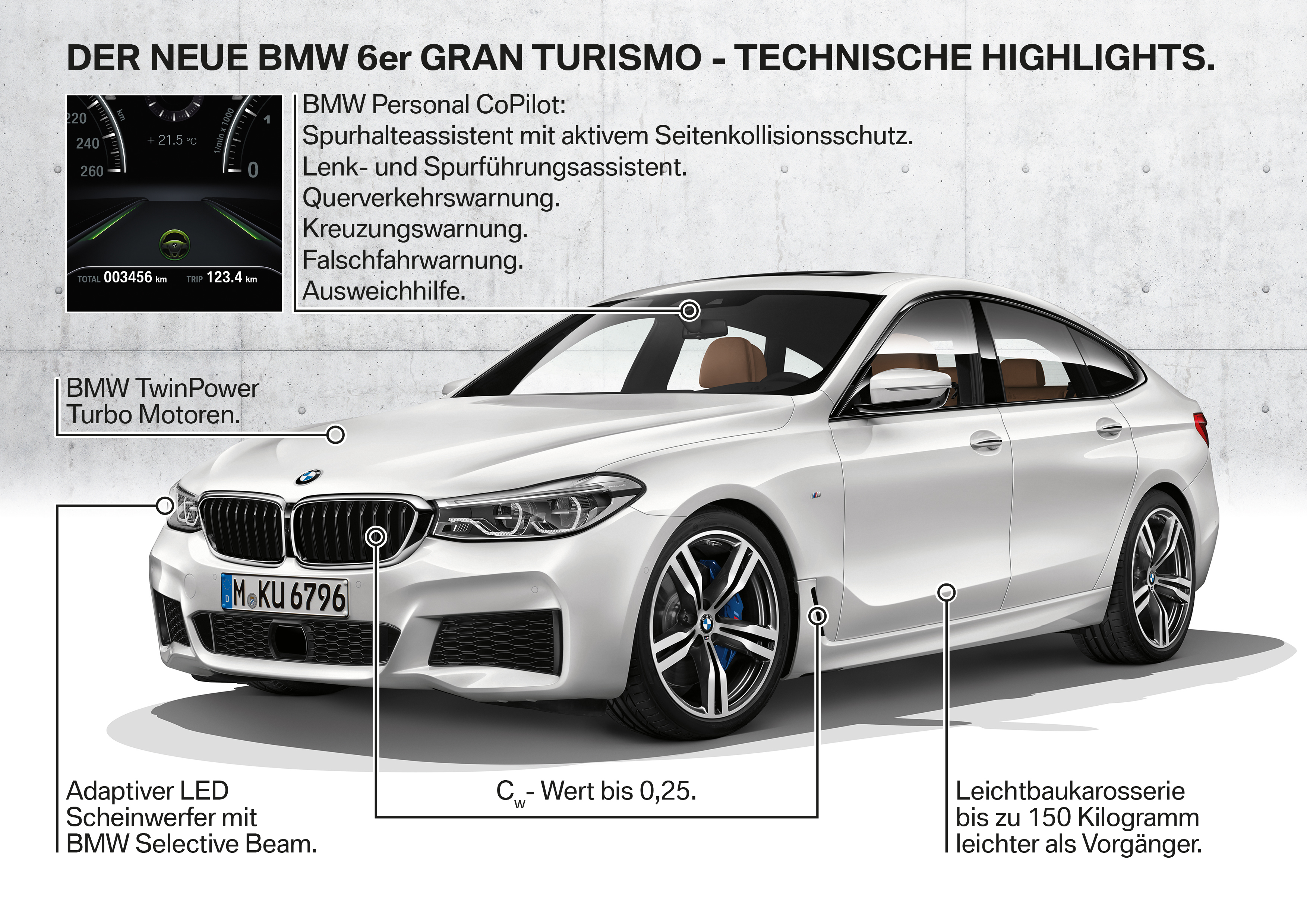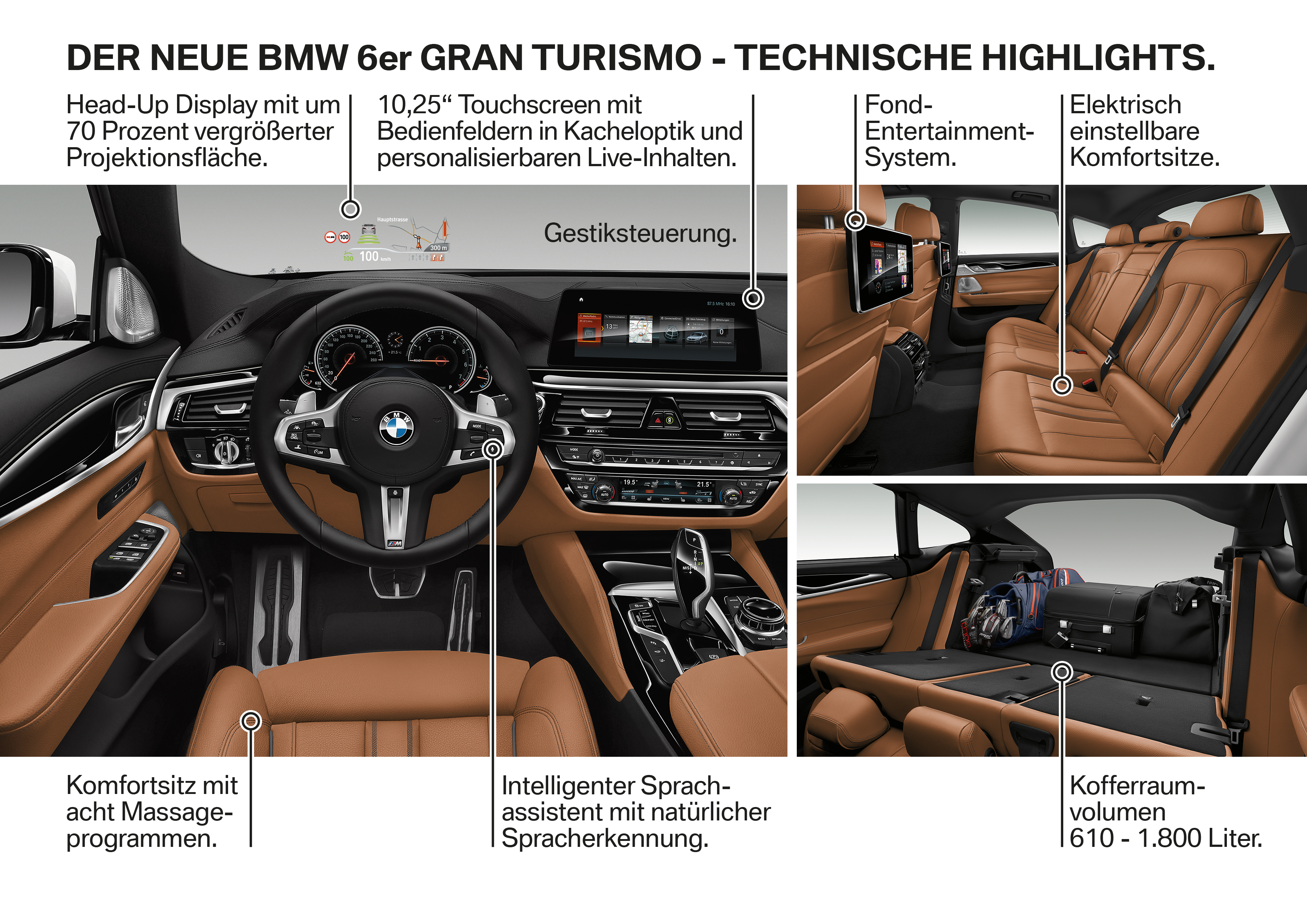 Die neue Modellbezeichnung ist Ausdruck der gegenüber dem BMW 5er Gran Turismo deutlich gesteigerten Produkt-Substanz. Die Weltpremiere des neuen BMW 6er Gran Turismo wird auf der IAA 2017 in Frankfurt (14.-24.09.-2017) stattfinden, die Markteinführung ist für November 2017 angekündigt.