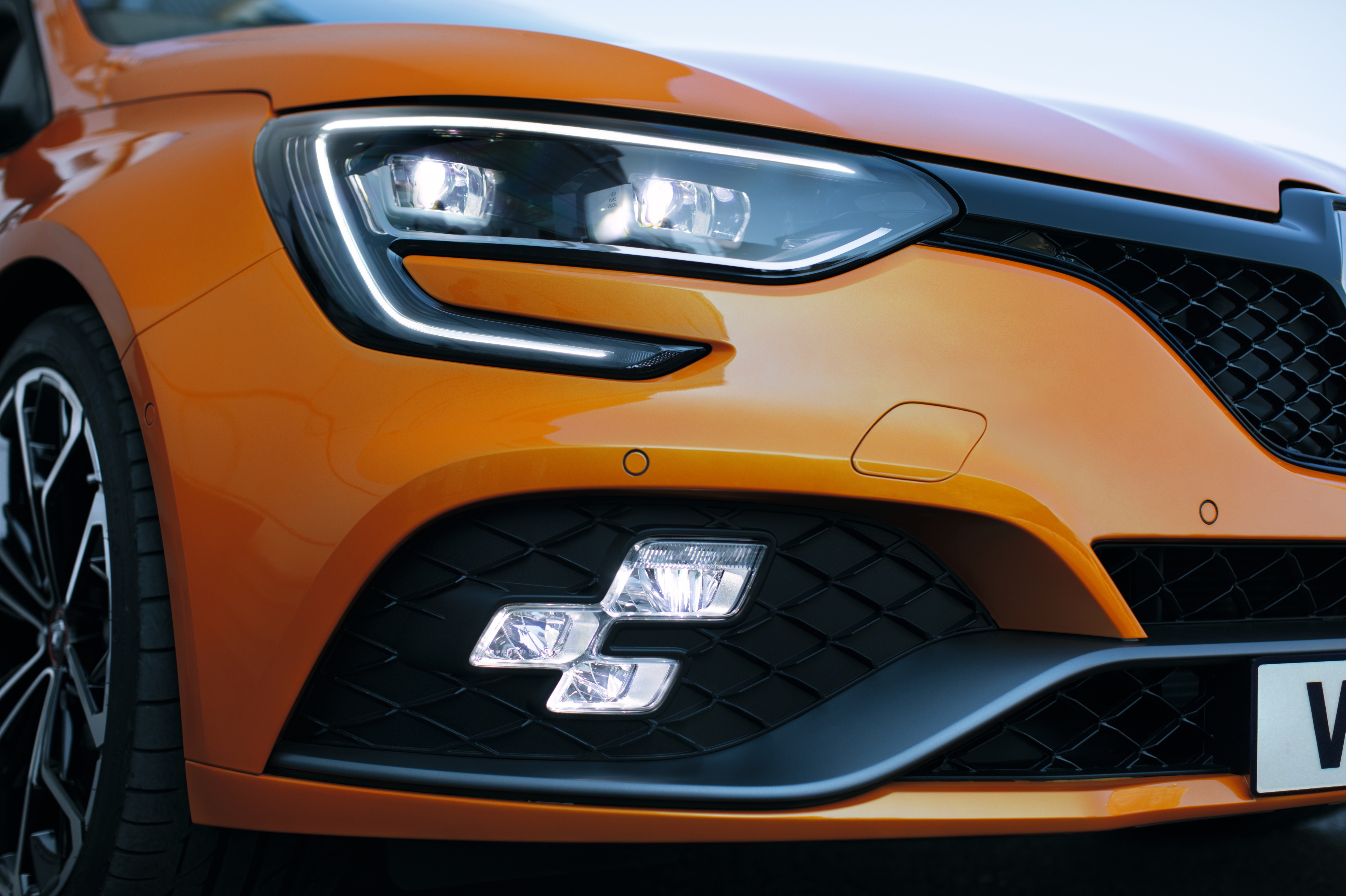 In die Frontschürze integriert sind wie bereits beim Clio R.S. die weit außen liegenden, aus jeweils drei Modulen bestehenden LED-Zusatzscheinwerfer R.S. Vision im Zielflaggendesign. Die Multi-Reflektoren-Technologie vereint in sich die Funktionen von Nebelscheinwerfern, Kurvenlicht, Fernlicht und Positionslicht. Als weiteres Novum sind in die LED-Tagfahrlichter in Form eines asymmetrischen „C“ erstmals bei einem Renault Modell die Blinker integriert.