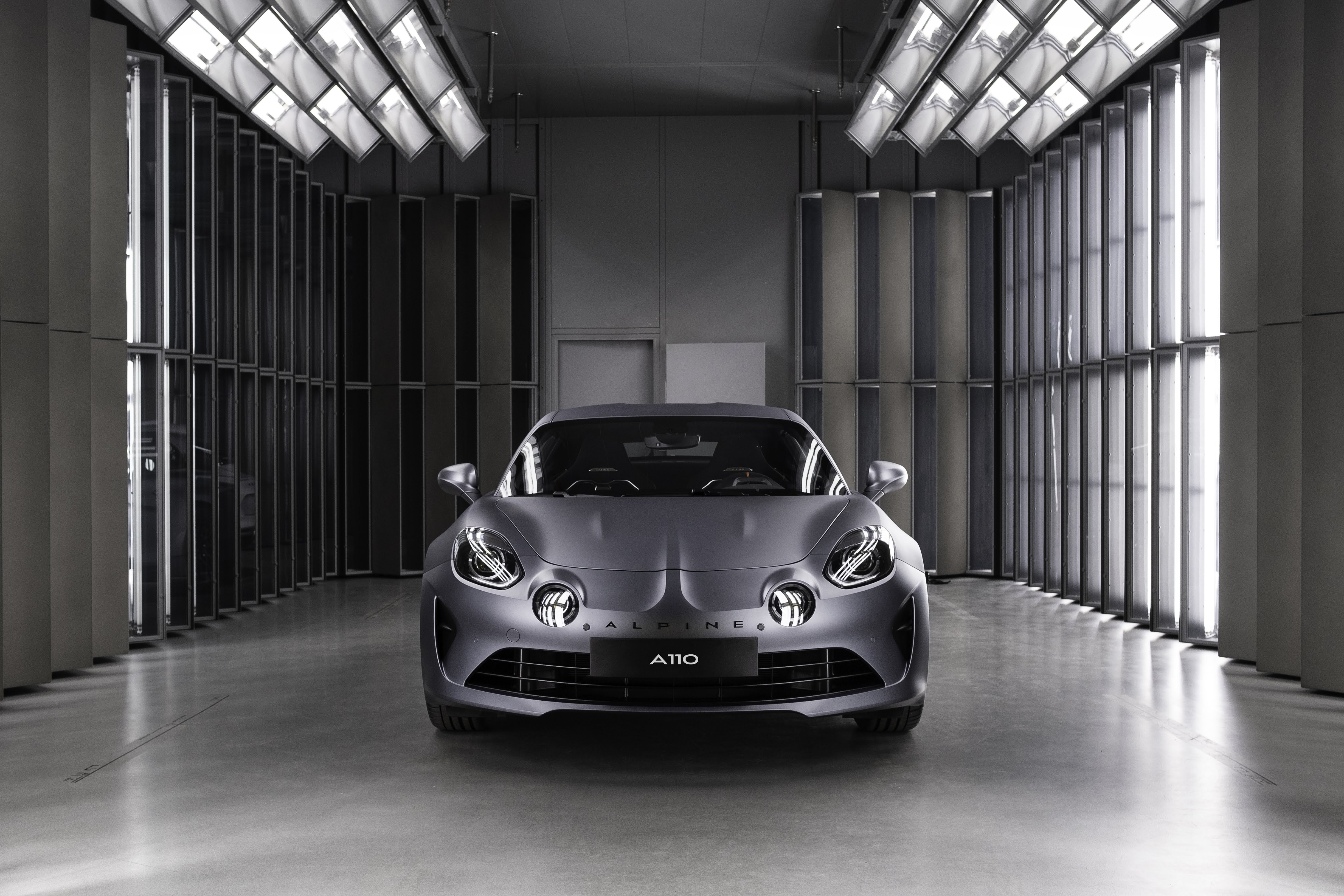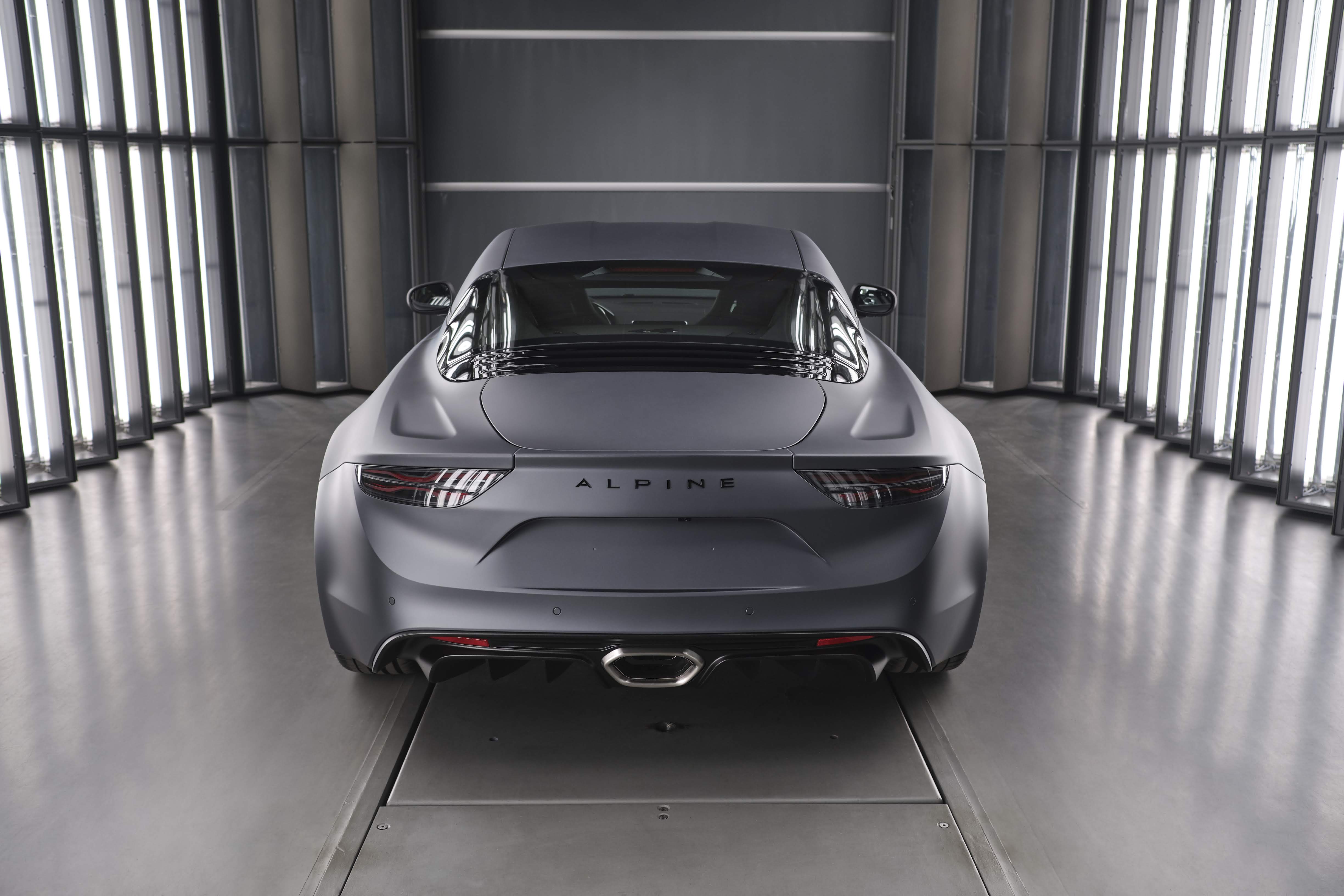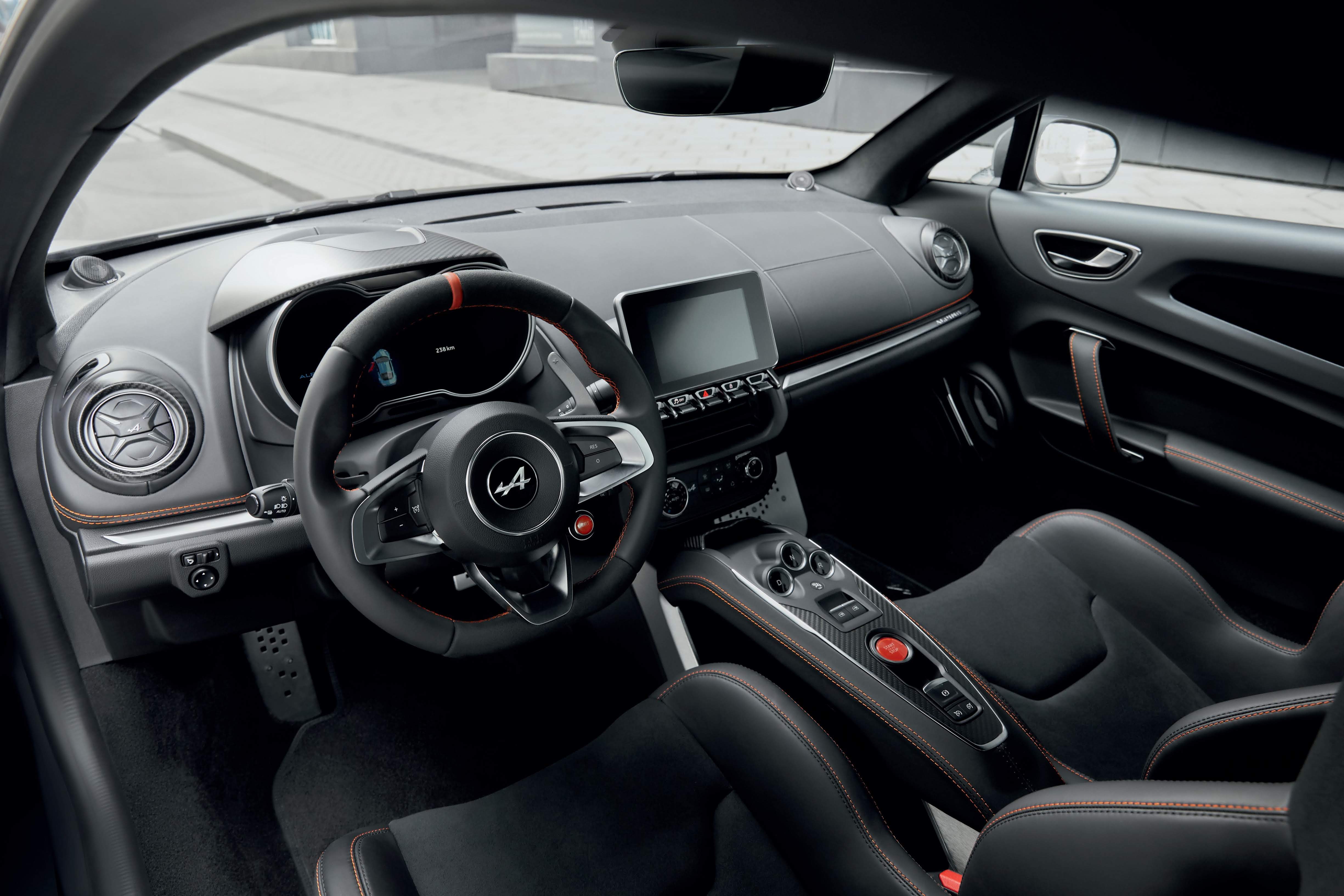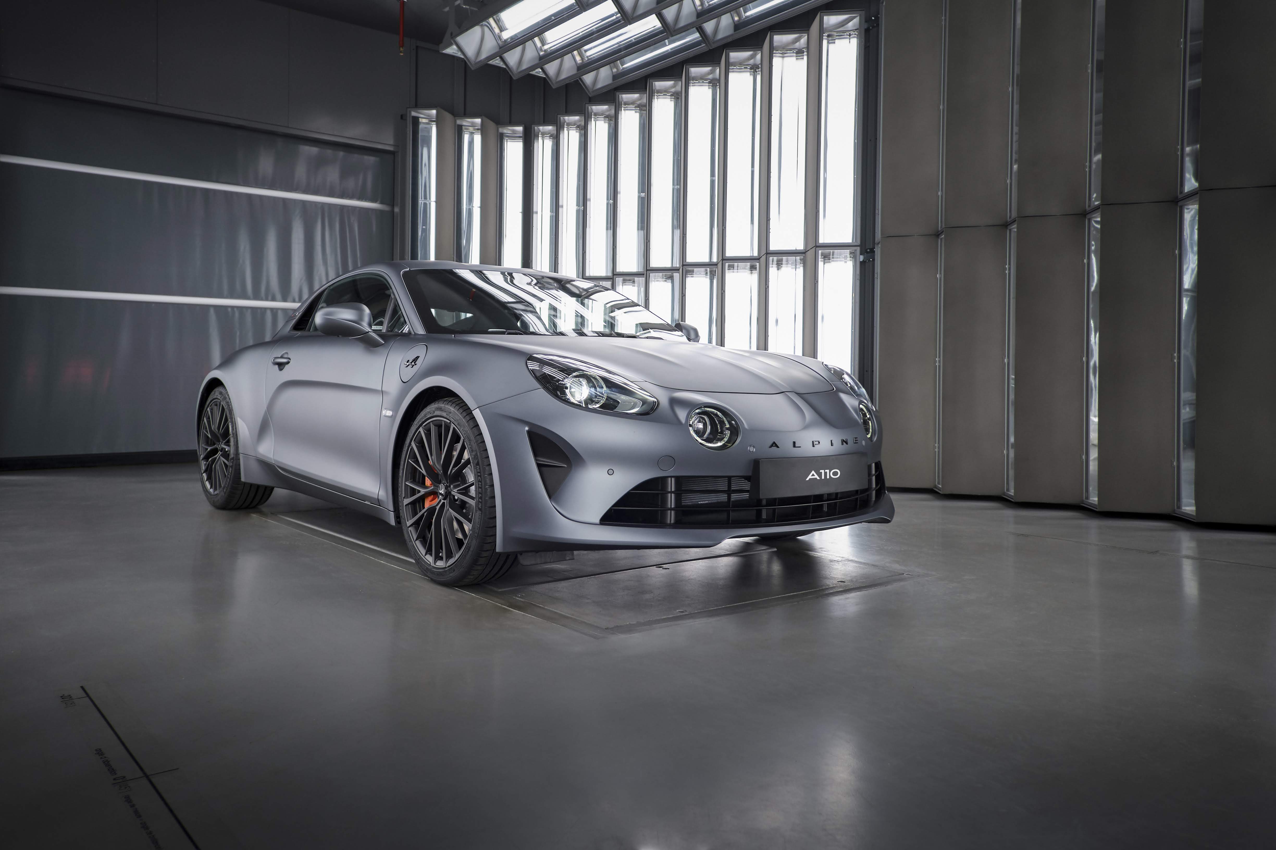 Äußerlich ist die Alpine A110S an den orange lackierten Bremssätteln, den speziell gestalteten „GT Race“-Rädern und den dezenten Flaggenlogos in Carbonoptik an der Hecksäule erkennbar. Exklusiv dem Topmodell vorbehalten ist der neue Matt-Farbton „Gris Tonnerre“.