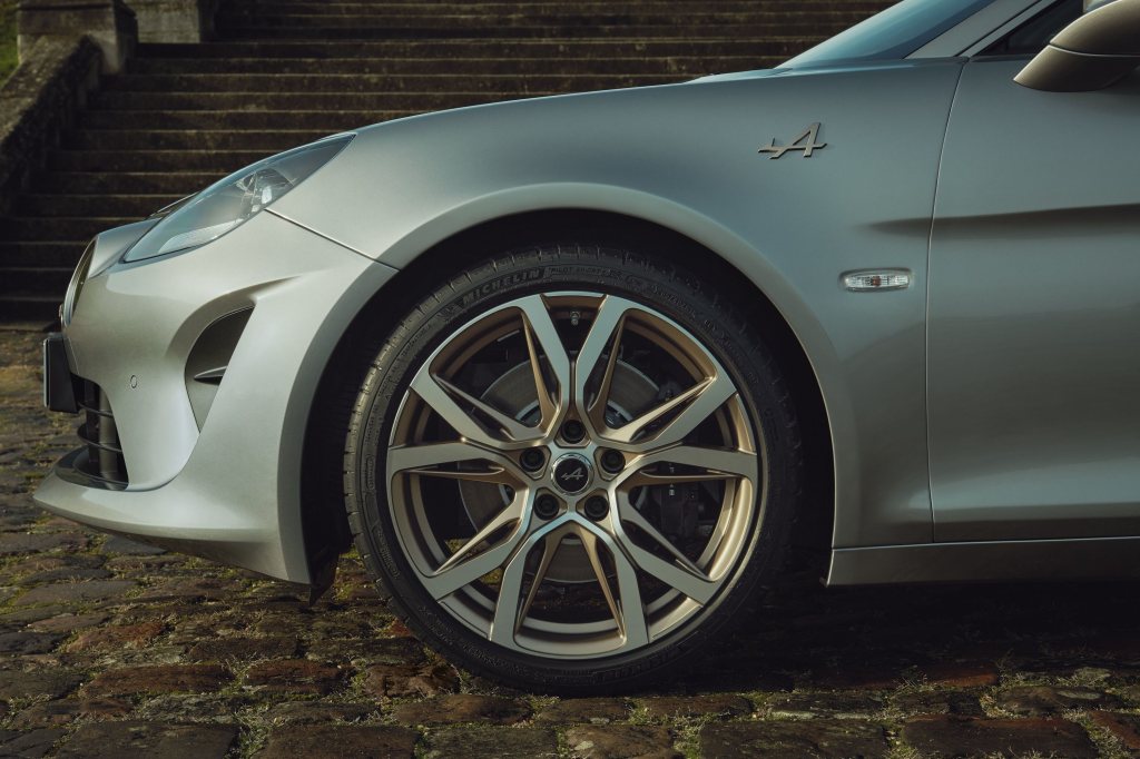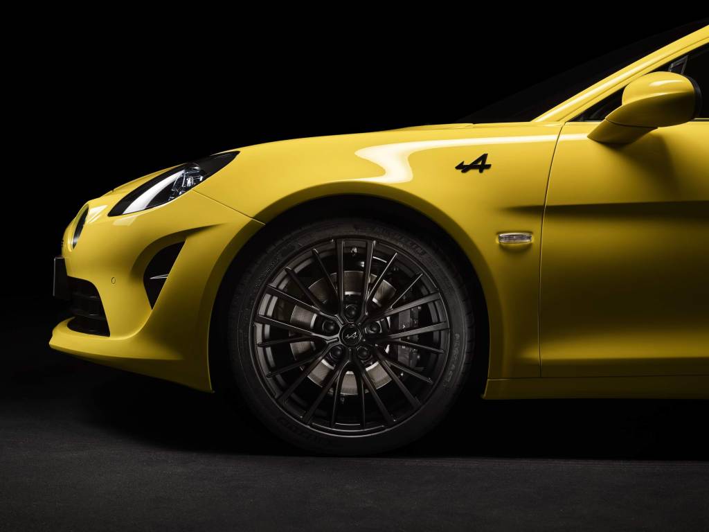 Diese Farbe war in den 1960er- und 1970er-Jahren bei den Alpine-Fahrern sehr beliebt. Die Alpine-Schriftzüge, Markenlogos, 18-Zoll-Felgen und Scheinwerfereinsätze sind in Schwarz gehalten – die Bremssättel in Anthrazit.