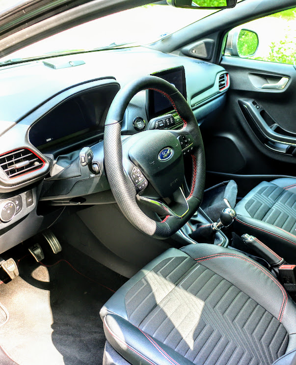 Straffe Sitze lassen dich ermüdungsfrei auch längere Distanzen bewältigen. Die sportlich orientierte ST-Line-Ausstattung bietet rote Ziernähte an Sitzen, Handbremse, Schalthebel-Manschette, etc. die das sonst schwarze Interieur aufpeppen.