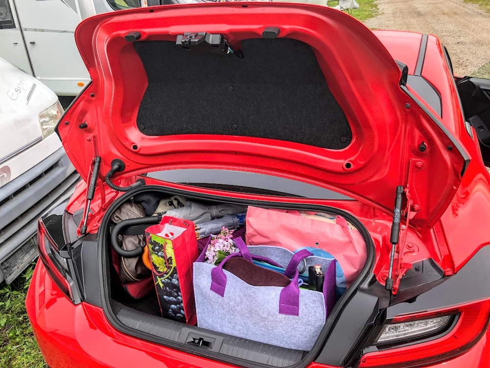 Einerseits bietet der Toyota GR86 ausreichend Platz für zwei erwachsene Menschen – sogar mit Gepäck für den Urlaub. Da helfen zusätzlich die beiden Notsitze in der zweiten Reihe. Sie eignen sich hervorragend als Ablagefläche und Stauraum, dafür um so weniger als echte Sitzgelegenheit – dafür sind die Platzverhältnisse zu beengt. Der Kofferraum hat ein ordentliches Maß, auch wenn eine Heckklappe einen besseren Zugang bieten würde.