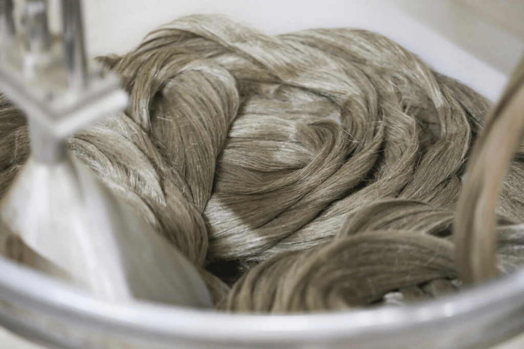 Um zu wachsen, braucht Flachs Erde, Wasser und Sonne. Doch bevor die zu Leinen gewobenen Fasern das Labor von Alpine erreichen, werden sie von Terre de Lin auf verschiedene Weise verarbeitet. Im März und April erfolgt die Aussaat, zu Beginn des Sommers werden die Pflanzen geerntet. Auf den Feldern in Reihen angeordnet, verrotten die Pflanzen – ein natürlicher Prozess, der die Flachsfasern von den Holzstängeln löst. Anschließend werden die langen Fasern gekämmt, geglättet, zu Garn gestreckt und zu 45 Kilogramm schweren Ballen gebündelt. In der Spinnerei wird das Material zu Stoff gewoben und anschließend an Alpine geliefert.