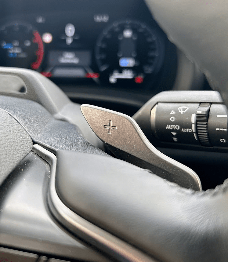 Mit den Schaltpaddles am Lenkrad kannst du simulierte Schaltstufen manuell durchschalten. Für die Fahrdynamik bringt es nichts (außer heulendem Motor), aber bei Bergabfahrten kannst du damit die Motorbremswirkung effizient nutzen.