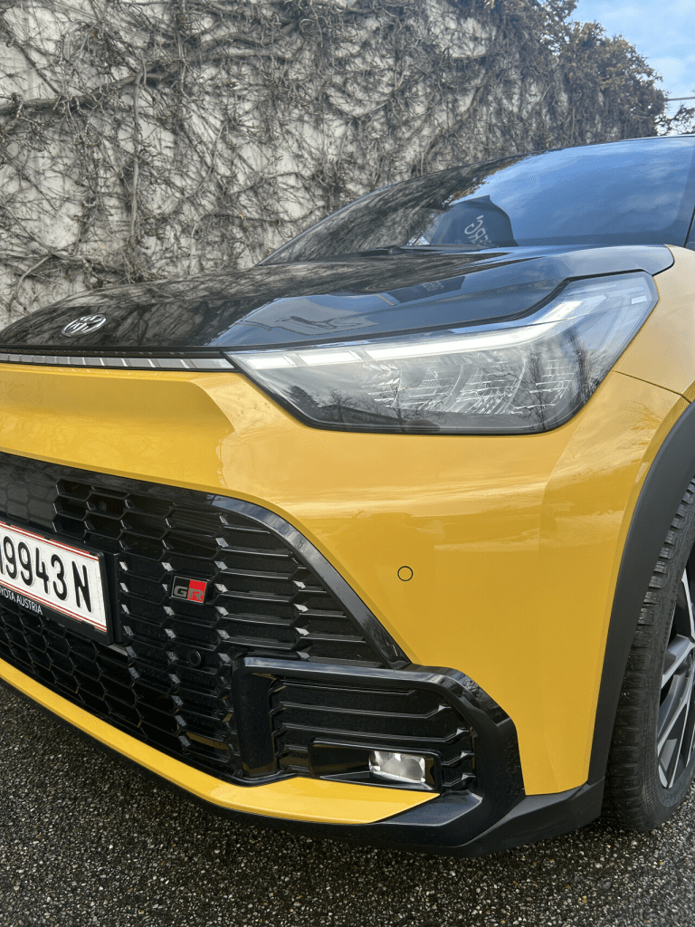 Der Aygo X erfrischt bereits optisch durch sein pfiffiges Aussehen und die poppigen Farben, wie beispielsweise das zweifarbige gelb-schwarz des Testautos. Die Ausstattungsvariante GR Sport lässt das Zwutschkerl gleich noch etwas frecher aus der markanten Frontpartie blinzeln.